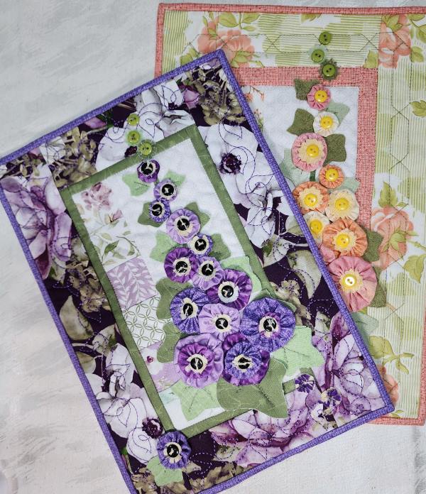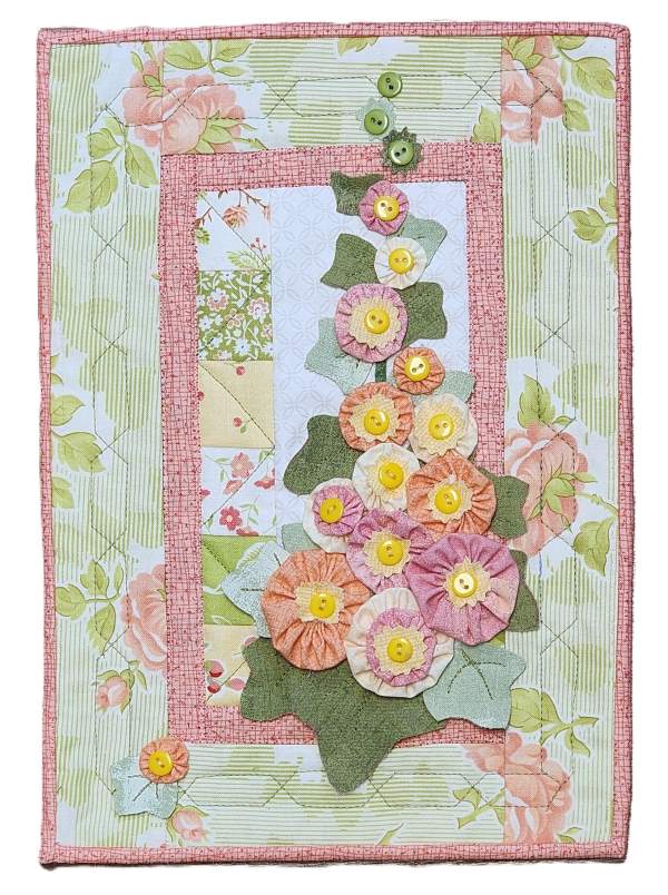 Start with a perfectly paper pieced background, right up to the final border. Apply the stem. Create dimensional leaves. Raw edged hollyhocks may be gathered by machine or by hand. The tiny green buds are little green buttons. Choose yellow or green buttons to enhance the flower center. Buttons may be stitched on by machine or by hand.