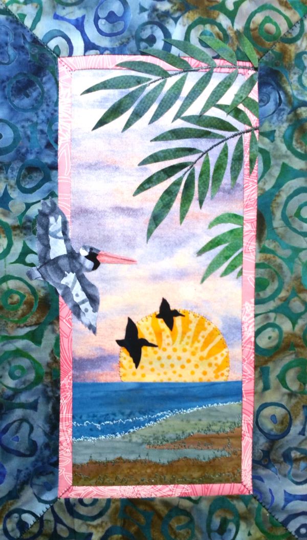 What a little charmer! This quilt has so many techniques all rolled up in one sweet little Pelican Pictorial Quilt project. Applique, tapered satin stitch, double-mitered borders, free motion surf, a tiny pelican eye, and a savvy technique for turning to get a perfectly straight closure. It's not strictly about technique, it's also learning the where and the why of the various techniques and how to creatively put them all together to produce a charming vignette quilt.