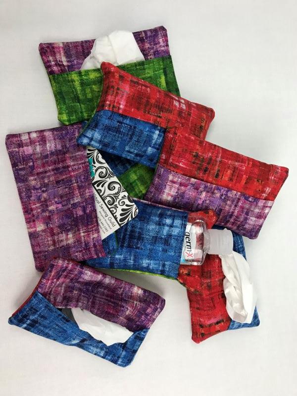 Material fee includes: fleece fabric, decorative and basic threads for all projects, precut fabric for tissue cases, fabric and zipper for pouch, elastic and instructions.