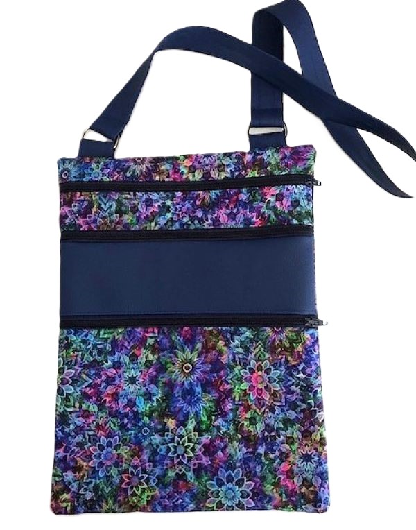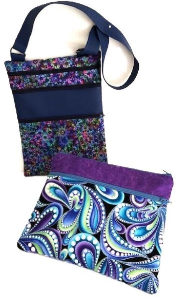 The first bag is constructed with cotton and has two lined zippered pockets. One of the bags will be constructed using faux leather and cotton fabrics and has three zippered pockets in the front and one in the back. All bags are completely lined, which is a great technique to learn.