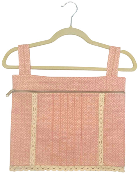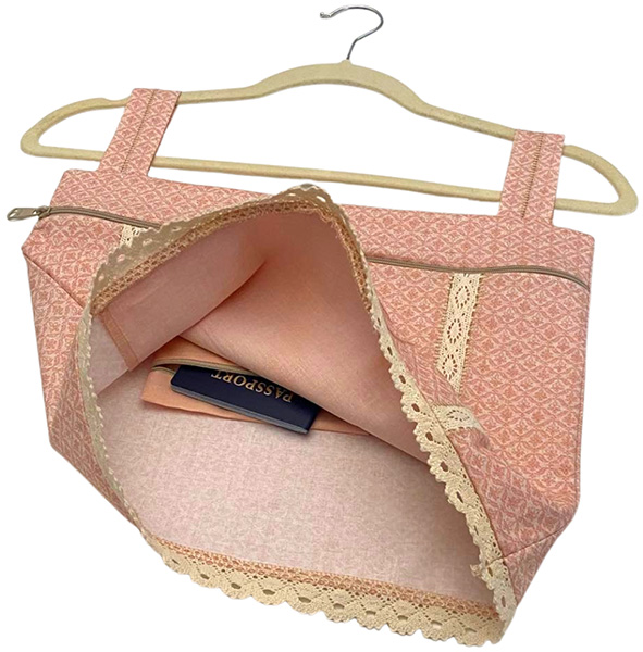 Keep your valuables safe in your closet under your clothing. Traditional safes are easy to spot and not portable. The hanger safe is neatly hidden under a jacket and thanks to the clever design, can even be placed under a low-cut blouse. The front is finished with five rolled hem pintucks, flat lace insertion creating a feminine heirloom camisole, also making it difficult for a thief to identify its true purpose. Above the decorative front, there is a zippered pocket extending the length of the safe with a lovely touch of scalloped edge lace along the bottom. Lastly, there is a hidden zipper pocket underneath for even more security and perfectly fits two passports. The entire safe is made on a serger with the use of a few added presser feet. This is a must-have item for your next travel adventure.