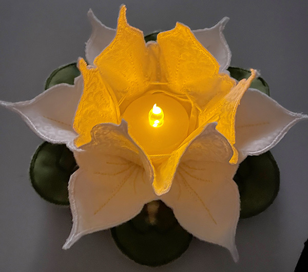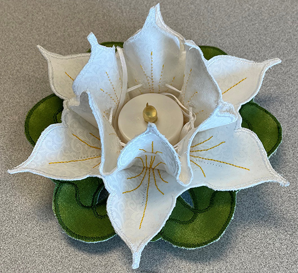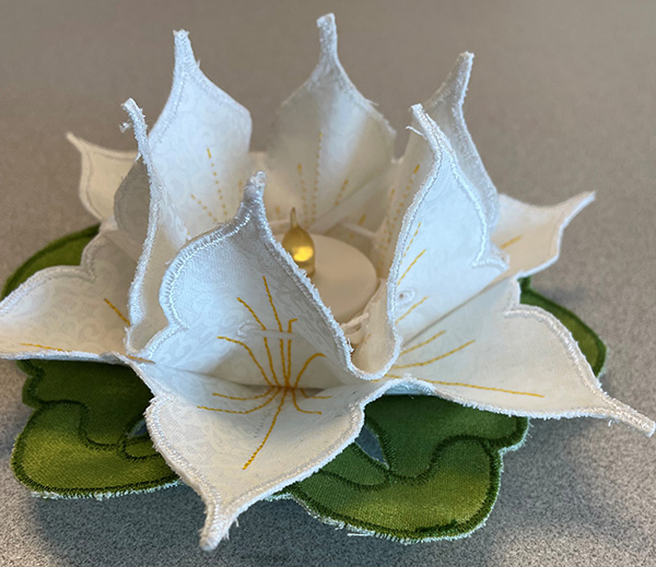 Three-dimensional machine embroidery is gaining popularity among enthusiasts. Jim has produced a way for you to recreate this 3D lotus flower that literally blooms before your eyes upon completion- all done in-the-hoop on an embroidery machine! Use it as a stunning centerpiece on the table for your next family gathering or make several and add a battery operated  tea light candle to the middle to create some unique mood lighting around the room. It is truly the perfect accent for any event and is sure to be the topic of conversation among your family and friends.