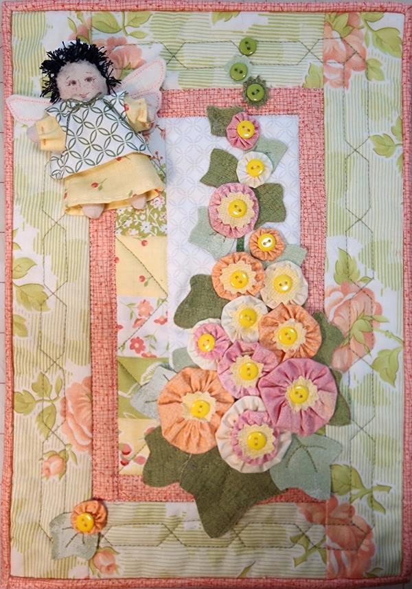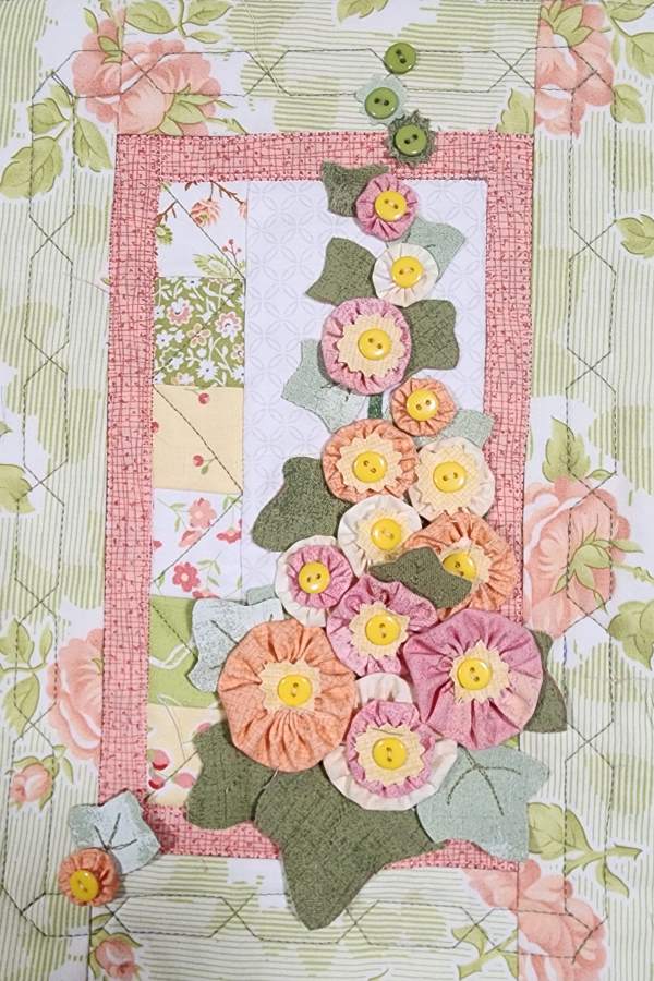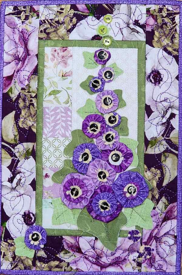 Start with a perfectly paper pieced background, right up to the final border. Apply the stem. Create dimensional leaves. Raw edged hollyhocks may be gathered by machine or by hand. The tiny green buds are little green buttons. Choose yellow or green buttons to enhance the flower center. Buttons may be stitched on by machine or by hand.