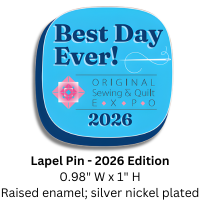 Proudly wear the 2026 commemorative Original Sewing & Quilt Expo pin. Order now, then redeem your Lapel Pin ticket at the Expo. You’ll want to collect them all!