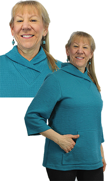 Let the cold wind blow while you stay comfy in the Lounger Pullover from Great Copy Patterns. The pullover features a slightly dropped shoulder, pocket options and a V-neck cowl that hugs your neck without being tight. Pattie will help you select the correct size from her try-on samples, assist you with any alterations needed, aid in pattern and fabric preparation while you construct this versatile pullover. Students can choose between a top or tunic length and which of the three sleeve lengths they prefer. The Lounger is sized Ladies Ex-Small through 3X. Your kit will include Great Copy 2720 Lounger pattern, fabric, thread, and stabilizers. Kit color may be different than pictured.