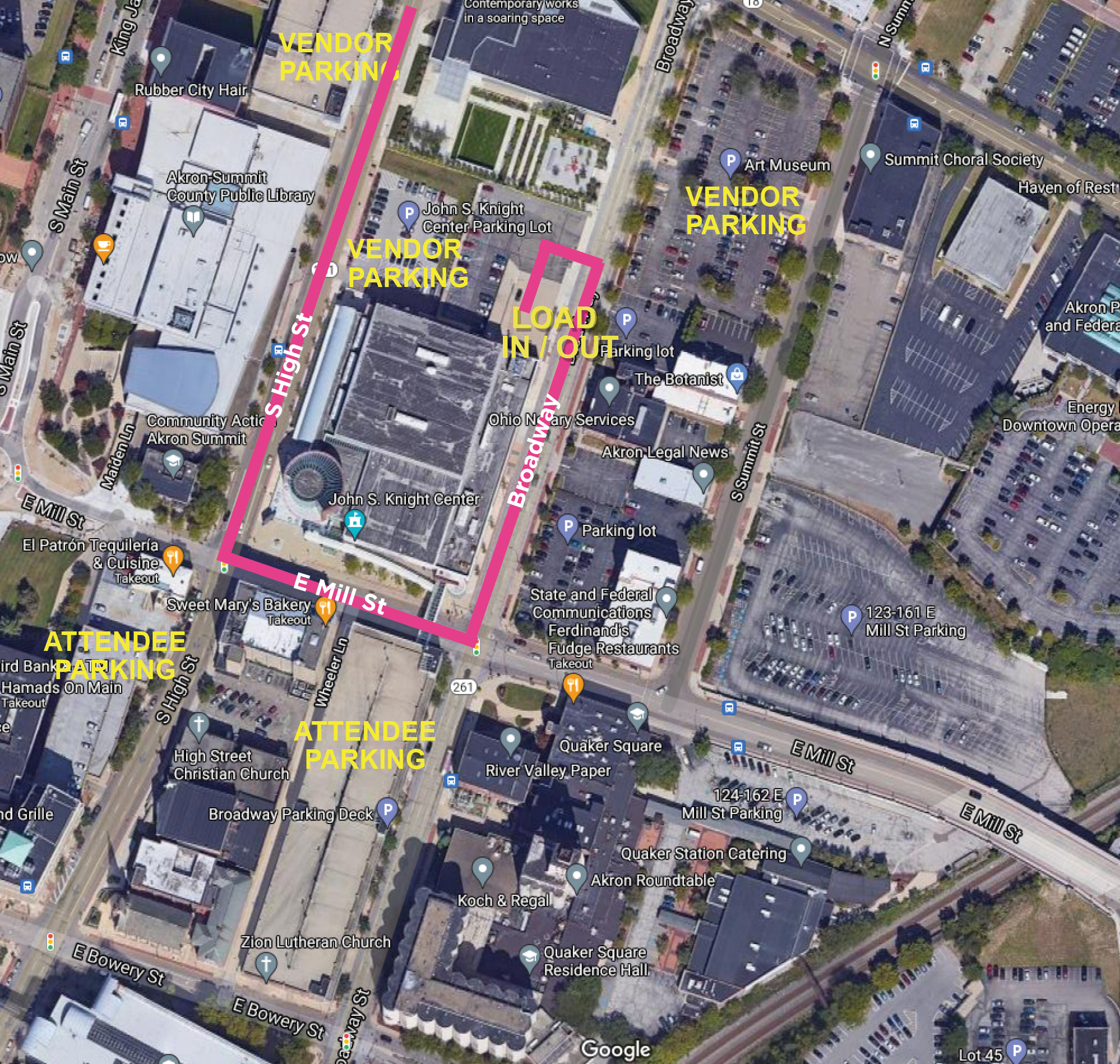 Vendors may park in the Art Museum open-air parking lot on S Broadway and E Market St. Enter the Art Museum lot from S Broadway just east of the loading area.